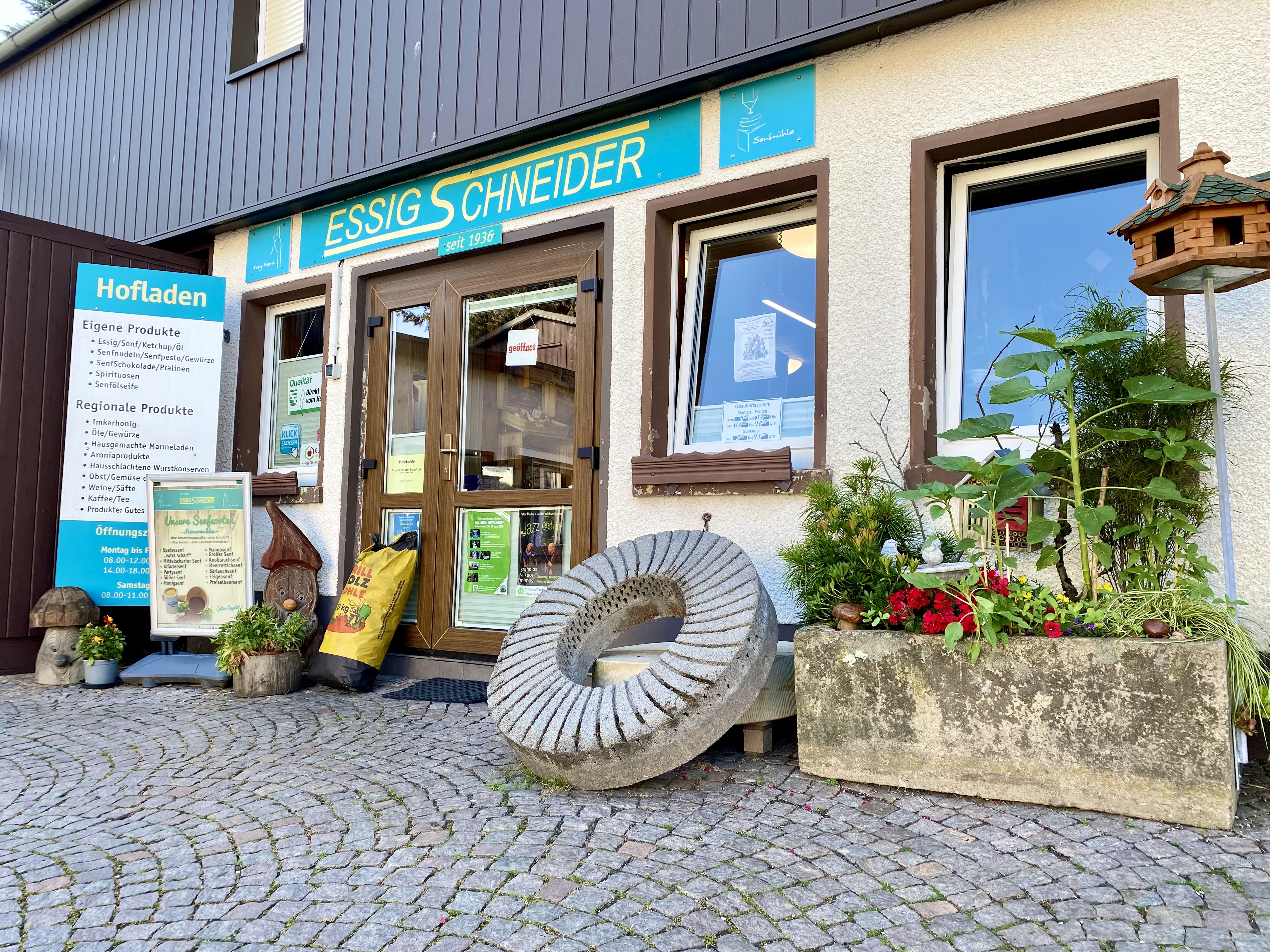 Entdecken Sie unsere beliebten Hausmarken: große Auswahl an verschiedenen Essig- und Senfsorten, hauseigene Spirituosen, Spezialitäten mit Senf (Nudeln, Schokolade und vieles mehr).
