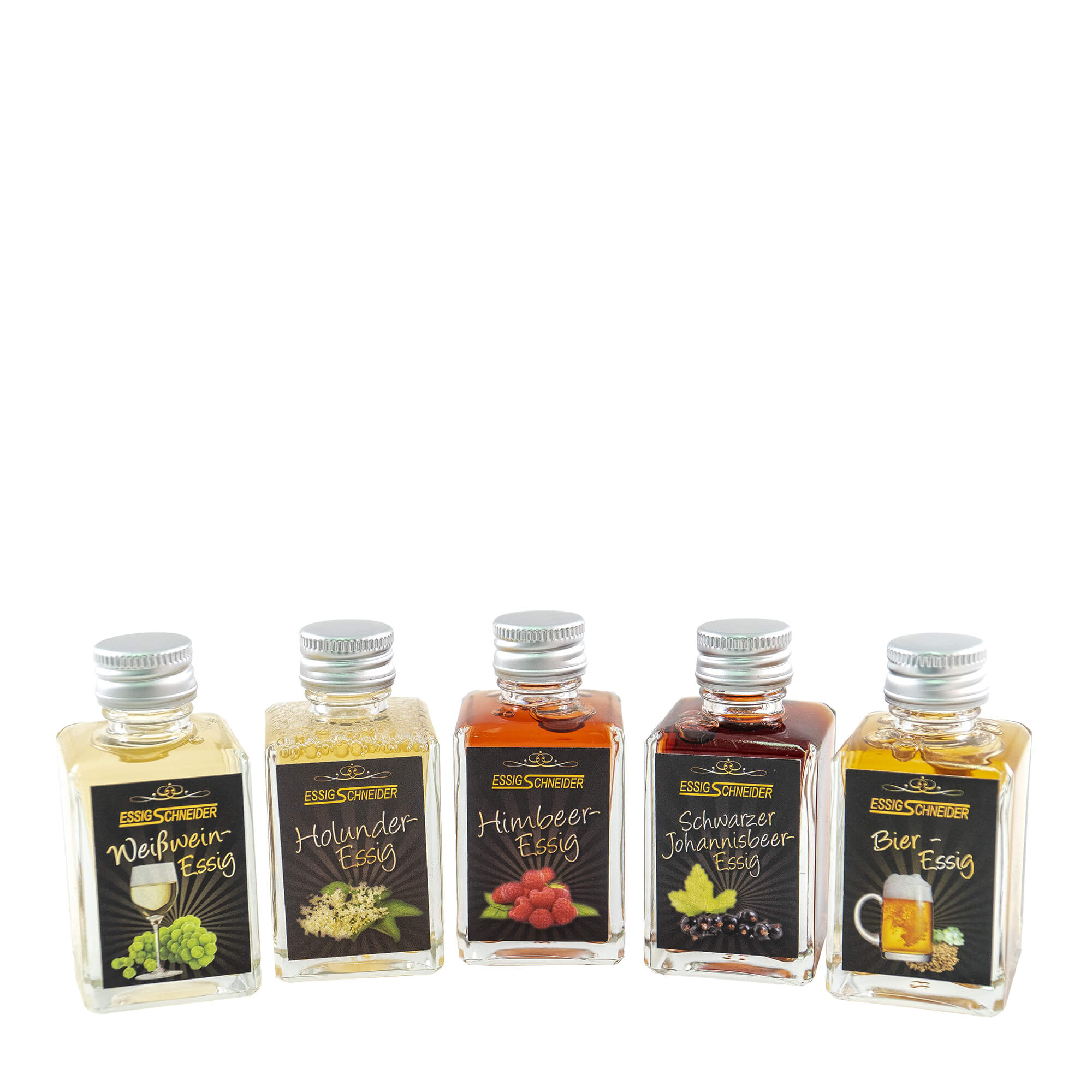 Inhalt: 5 x 30 ml Flasche Brombeeressig - Holunderblütenessig - Rotweinessig - Trüffelessig - Zitronenthymianessig