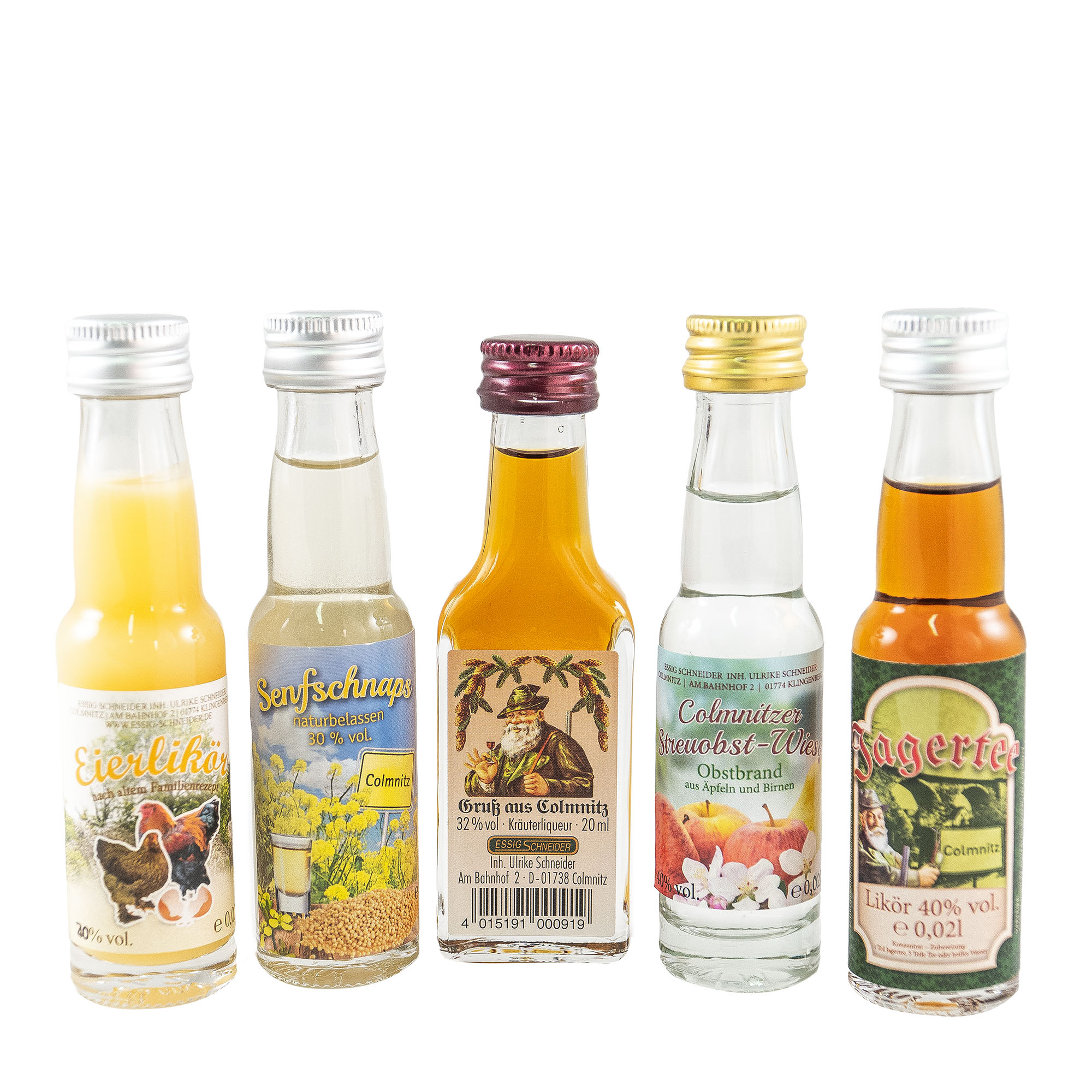 Inhalt: 5 x 20 ml Flaschen Eierlikör - Senfschnaps - Kräuterlikör - Streuobstwiesenbrand - Jagertee